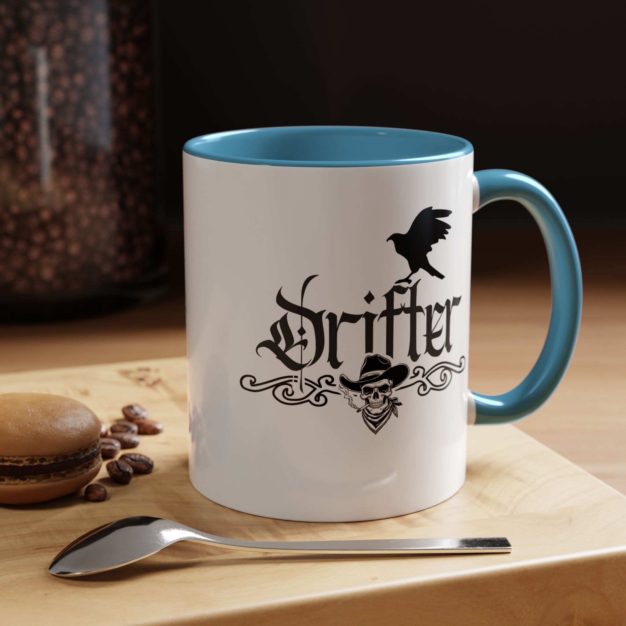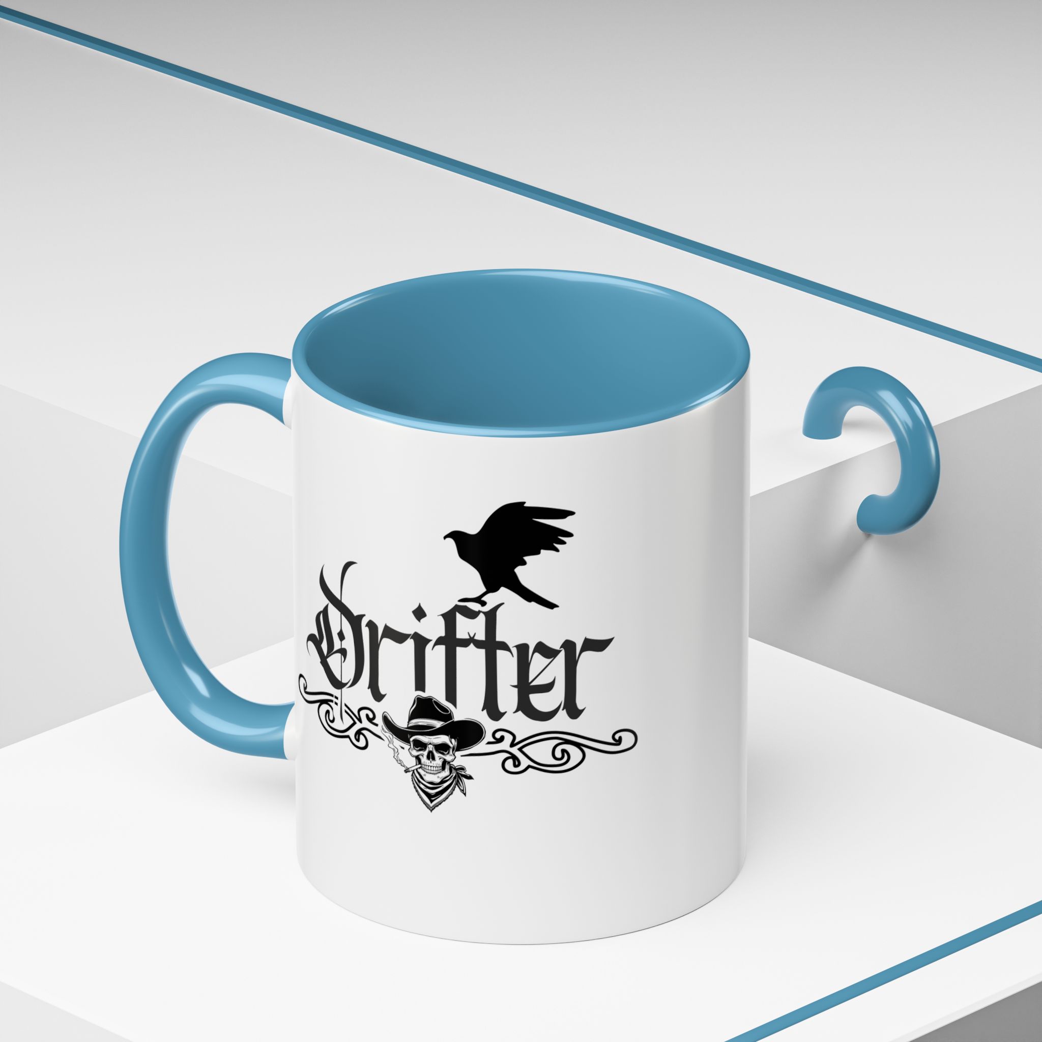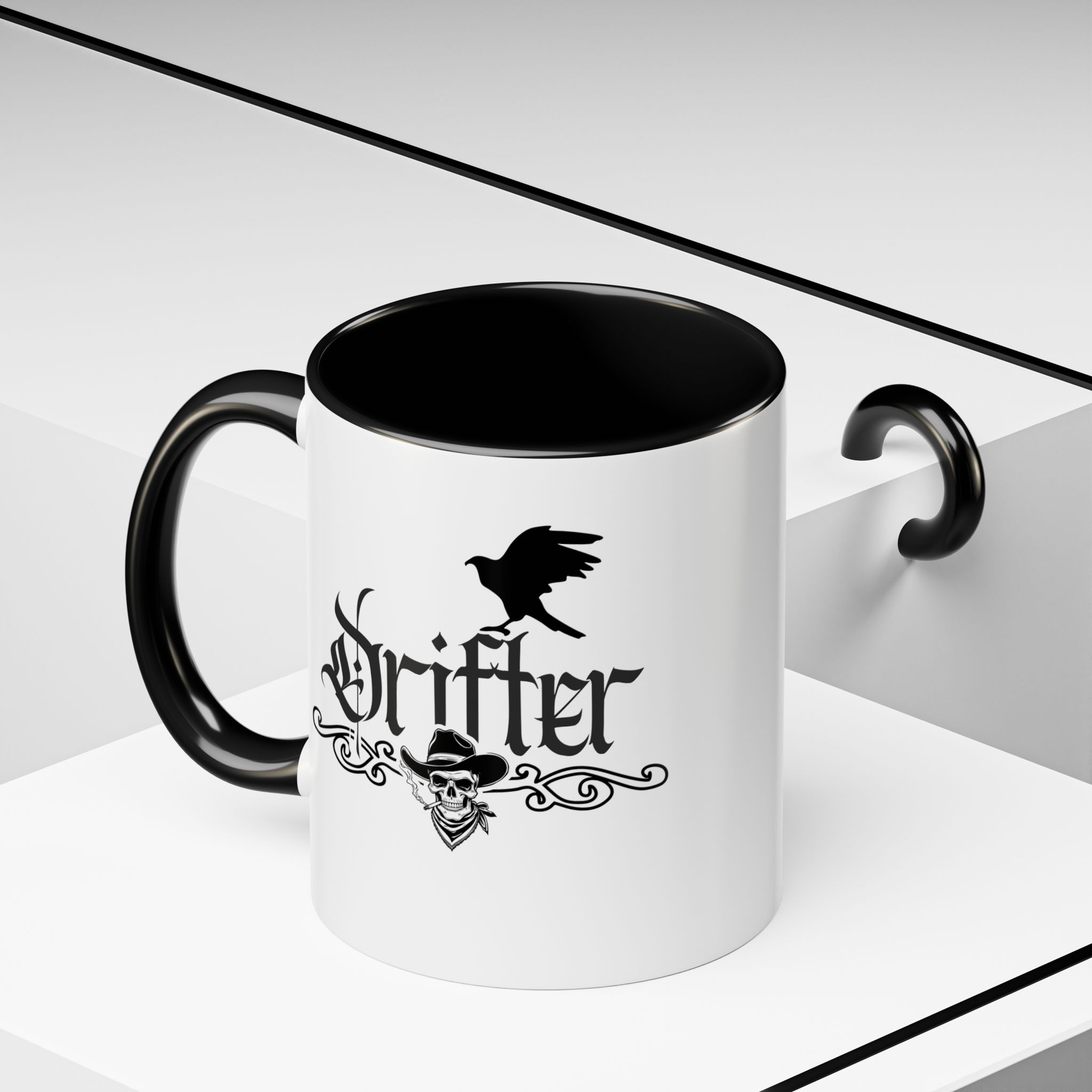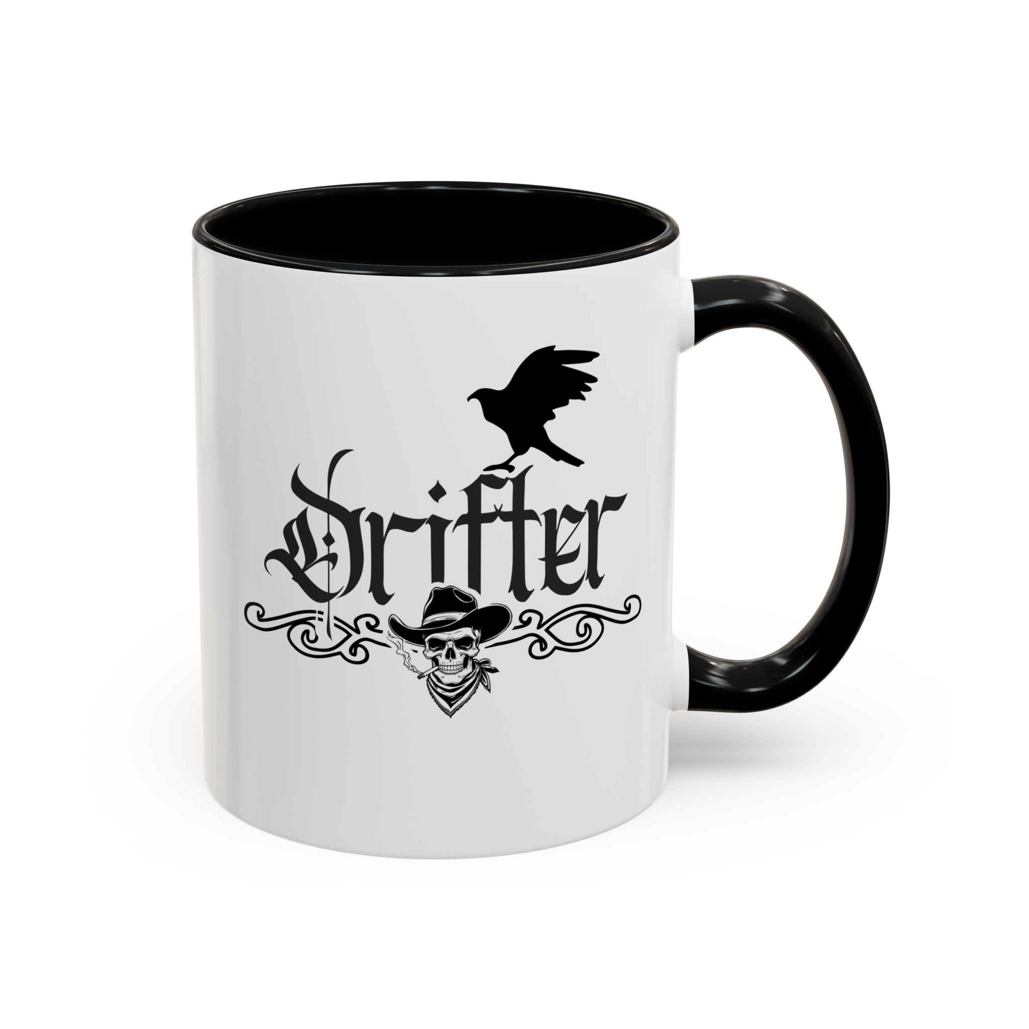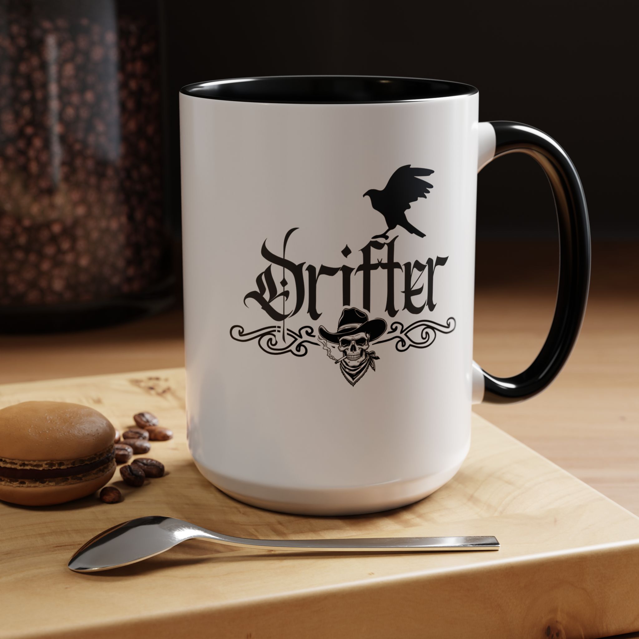 This ceramic accent mug brings a dark, wanderer energy to your morning ritual. A bold black interior and handle frame a stark white exterior, where gothic lettering, a crow in flight, and a skull-in-hat emblem sit like a badge of the road. Sipping from it feels like stepping into a story — smoke-swung diners, empty highways at dawn, and the quiet company of a restless heart. It’s made to be used: glossy finish, dishwasher- and microwave-safe, and available in two sizes so your coffee or tea keeps pace with your day. Choose a contrasting color handle to match the mood you carry.