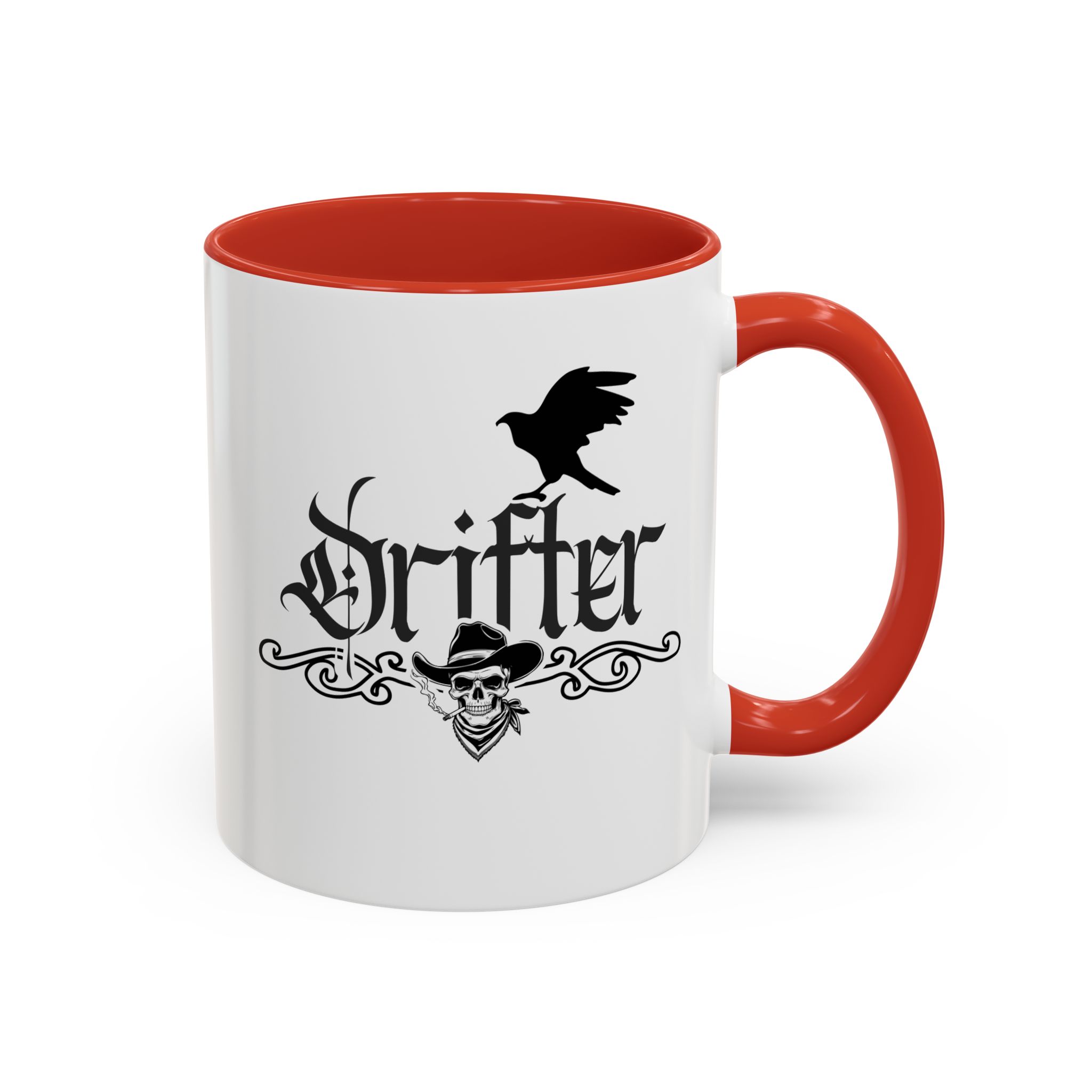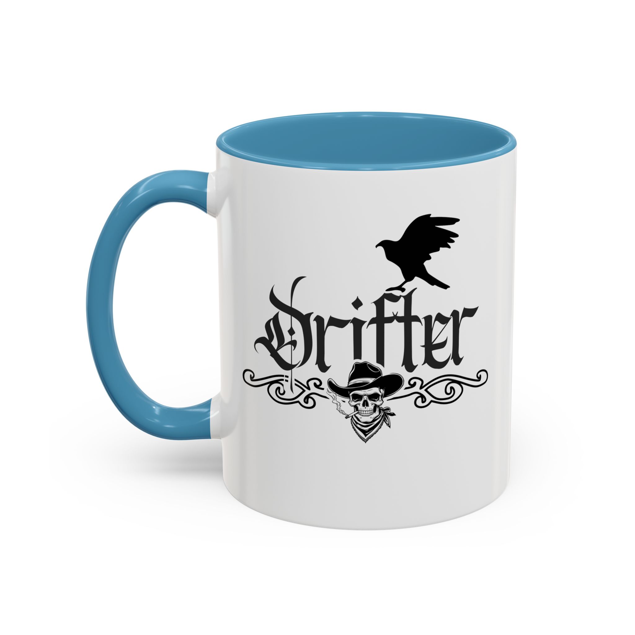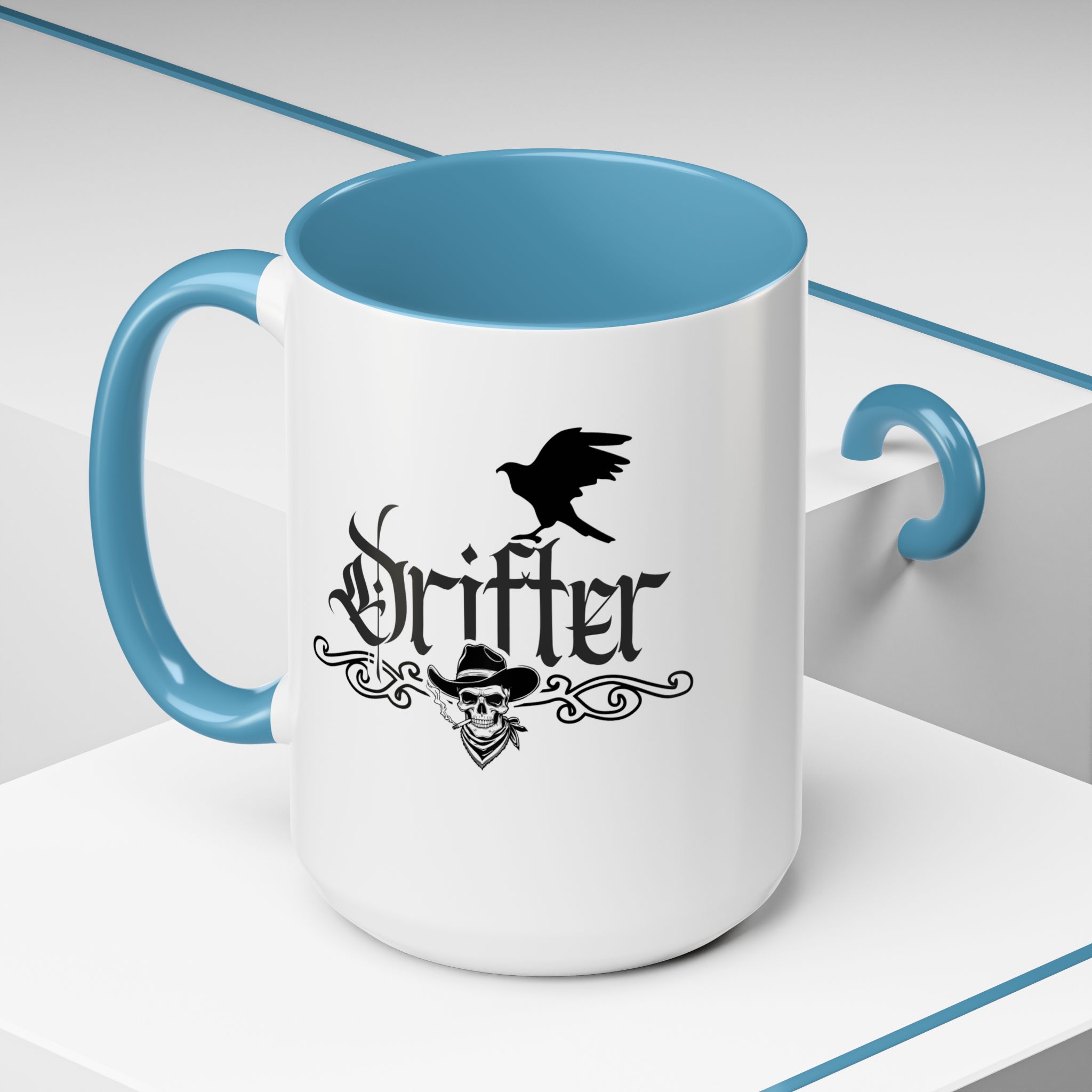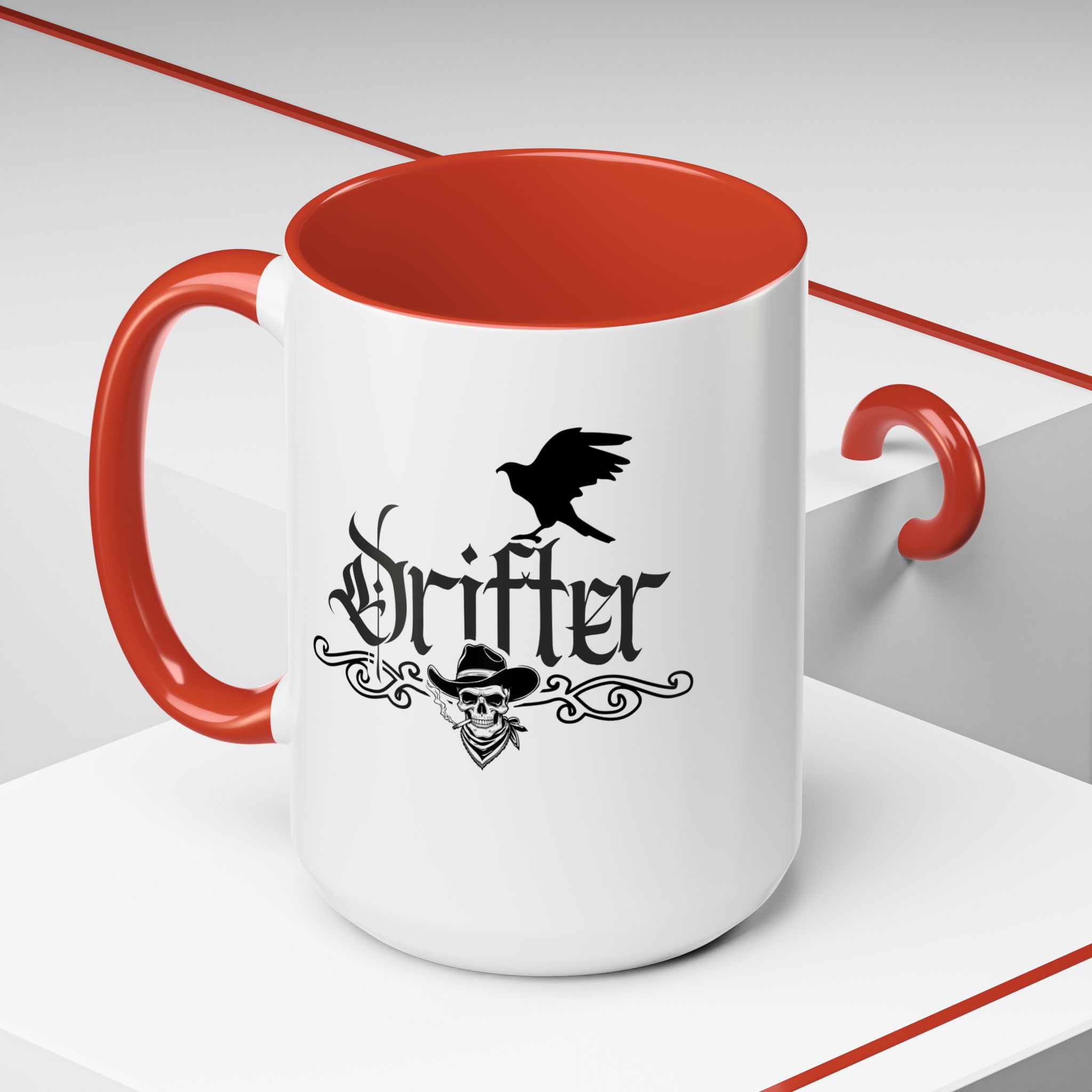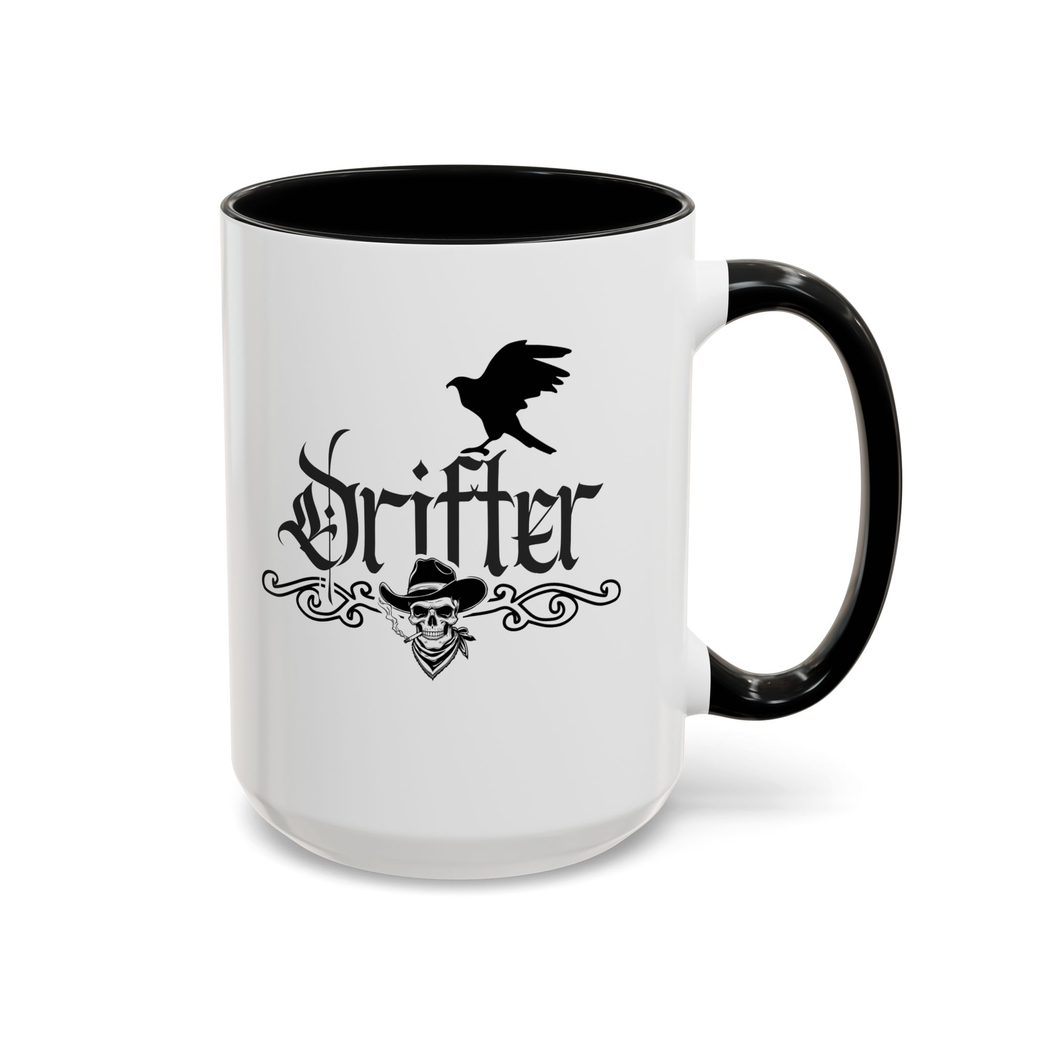 This ceramic accent mug brings a dark, wanderer energy to your morning ritual. A bold black interior and handle frame a stark white exterior, where gothic lettering, a crow in flight, and a skull-in-hat emblem sit like a badge of the road. Sipping from it feels like stepping into a story — smoke-swung diners, empty highways at dawn, and the quiet company of a restless heart. It’s made to be used: glossy finish, dishwasher- and microwave-safe, and available in two sizes so your coffee or tea keeps pace with your day. Choose a contrasting color handle to match the mood you carry.