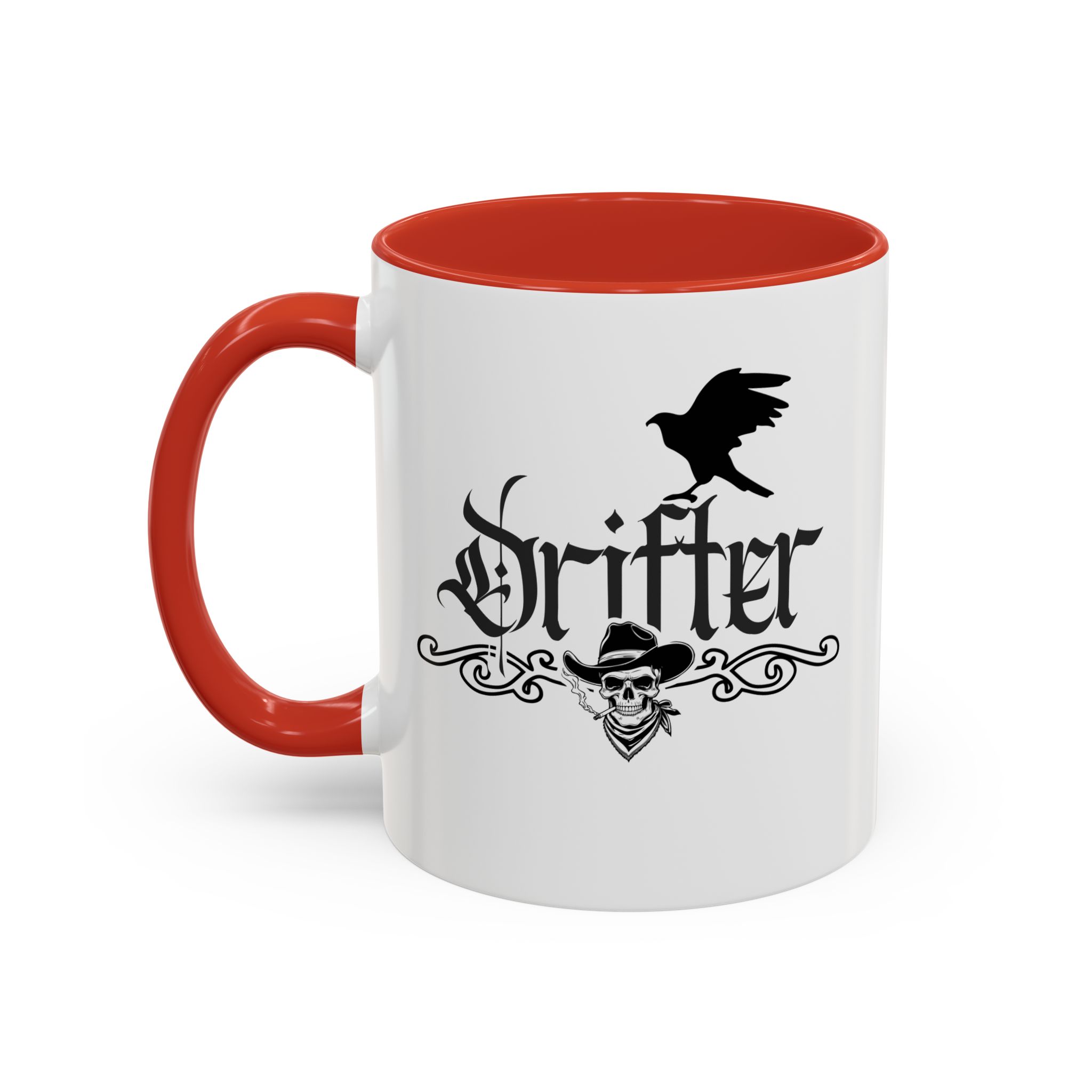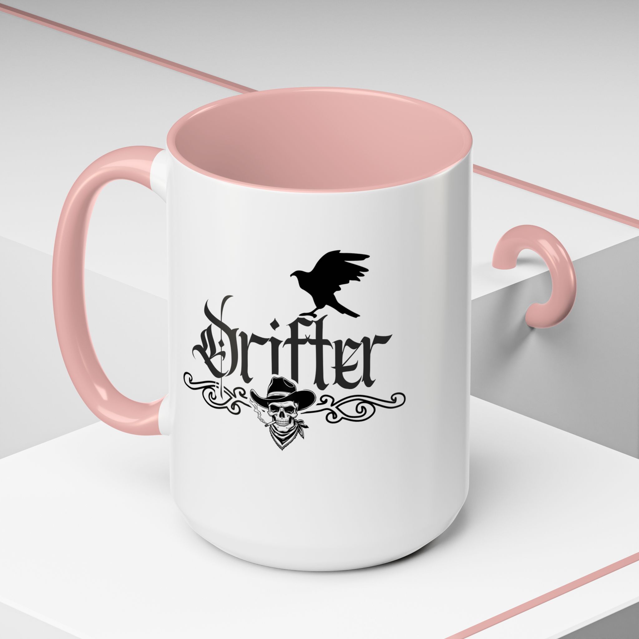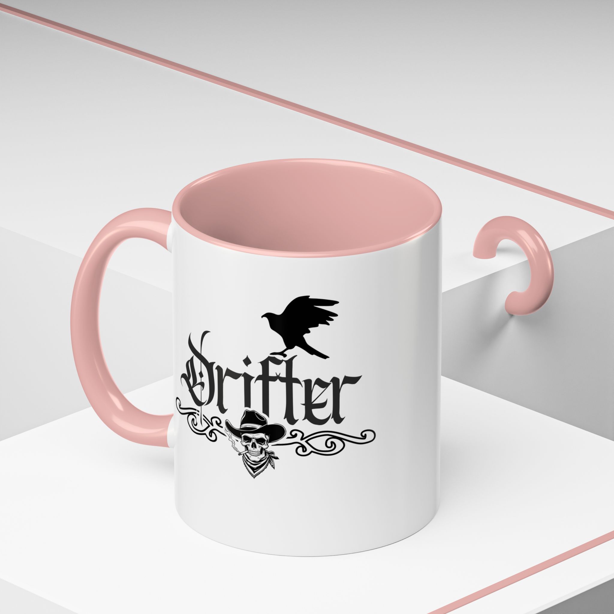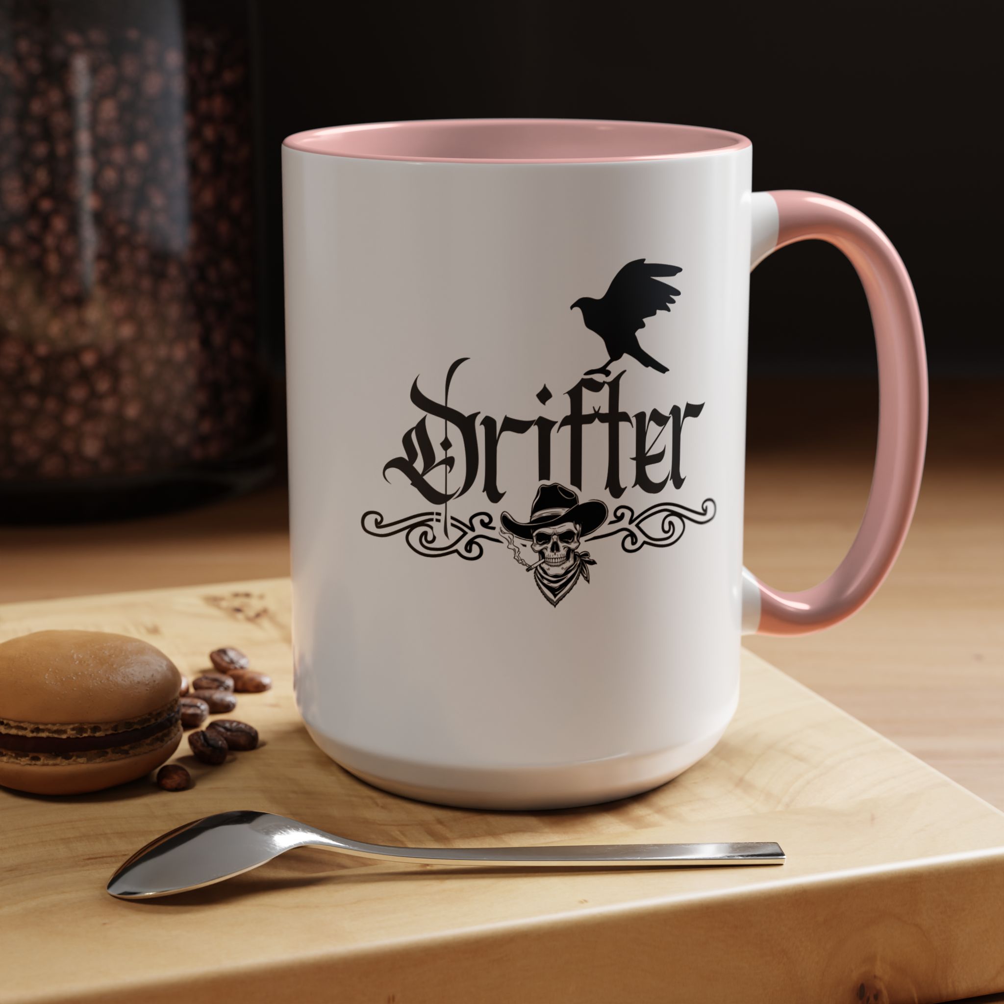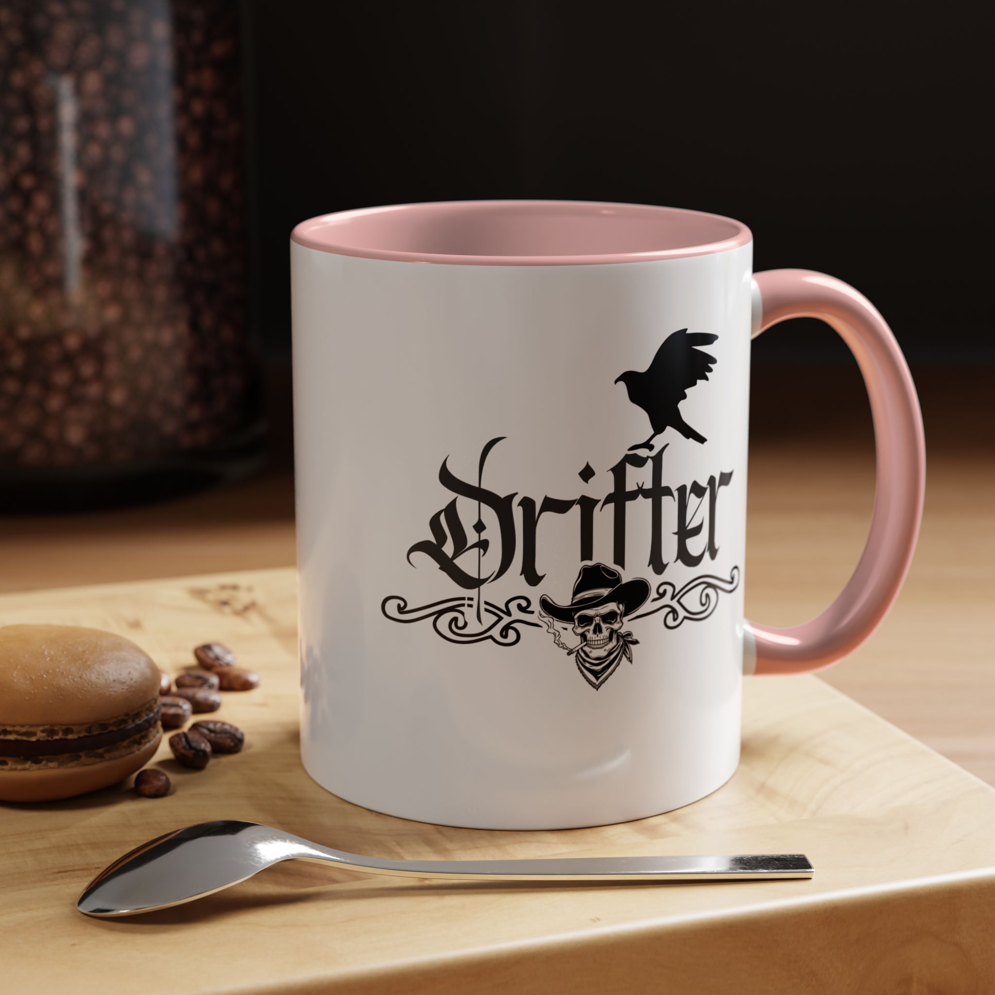 This ceramic accent mug brings a dark, wanderer energy to your morning ritual. A bold black interior and handle frame a stark white exterior, where gothic lettering, a crow in flight, and a skull-in-hat emblem sit like a badge of the road. Sipping from it feels like stepping into a story — smoke-swung diners, empty highways at dawn, and the quiet company of a restless heart. It’s made to be used: glossy finish, dishwasher- and microwave-safe, and available in two sizes so your coffee or tea keeps pace with your day. Choose a contrasting color handle to match the mood you carry.