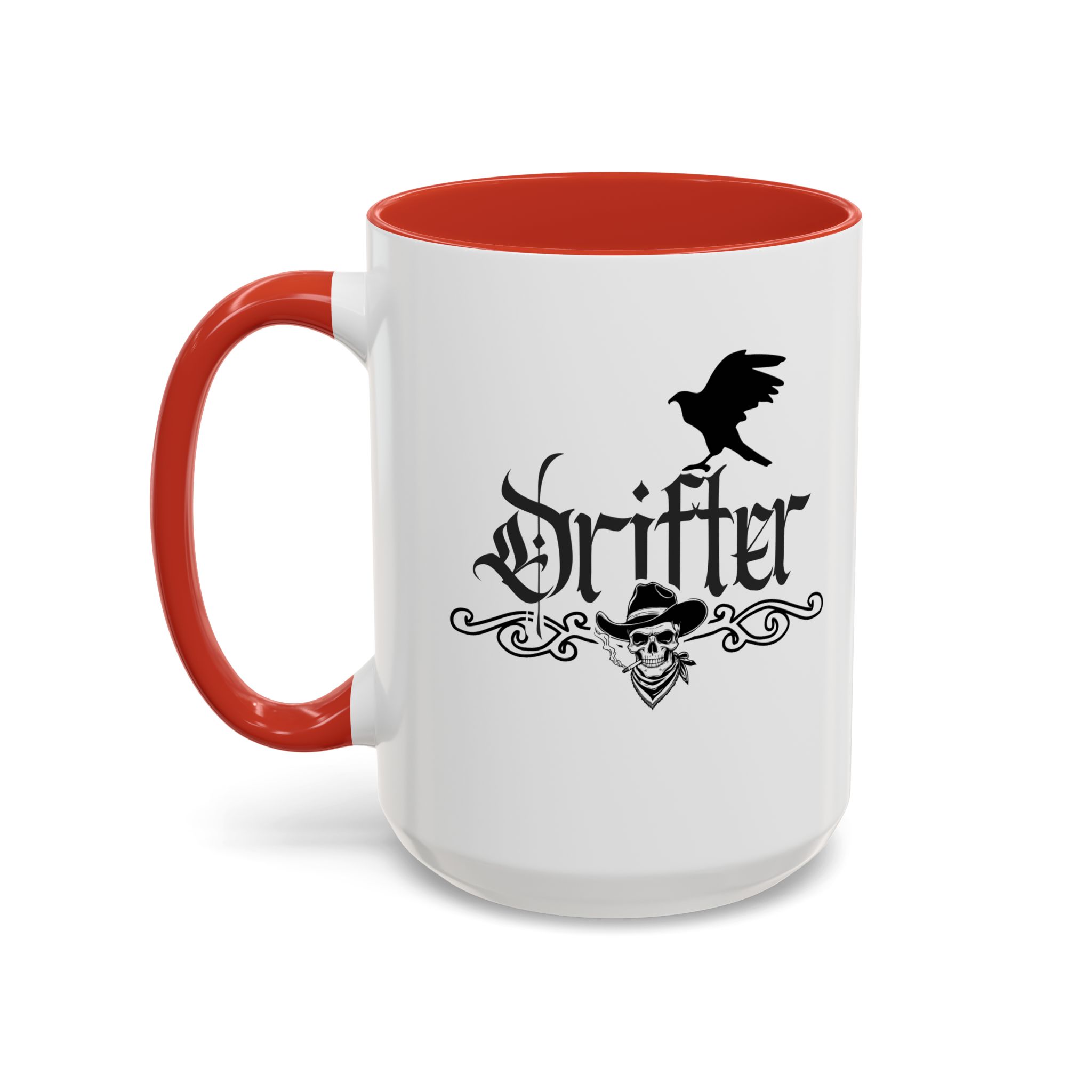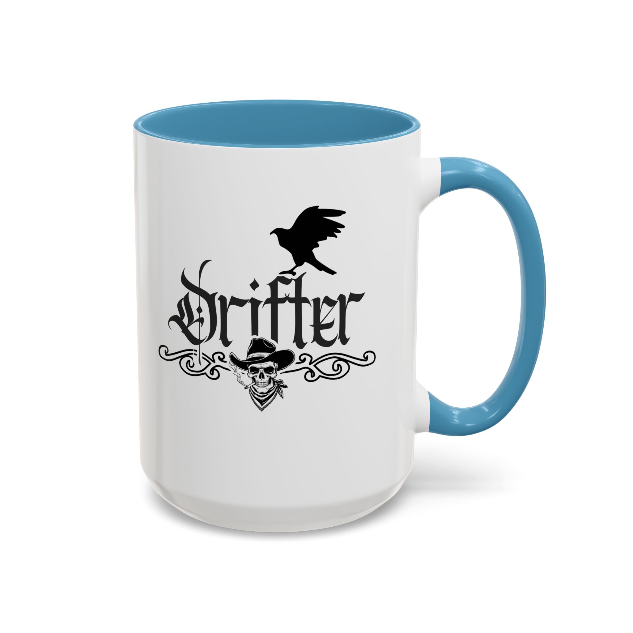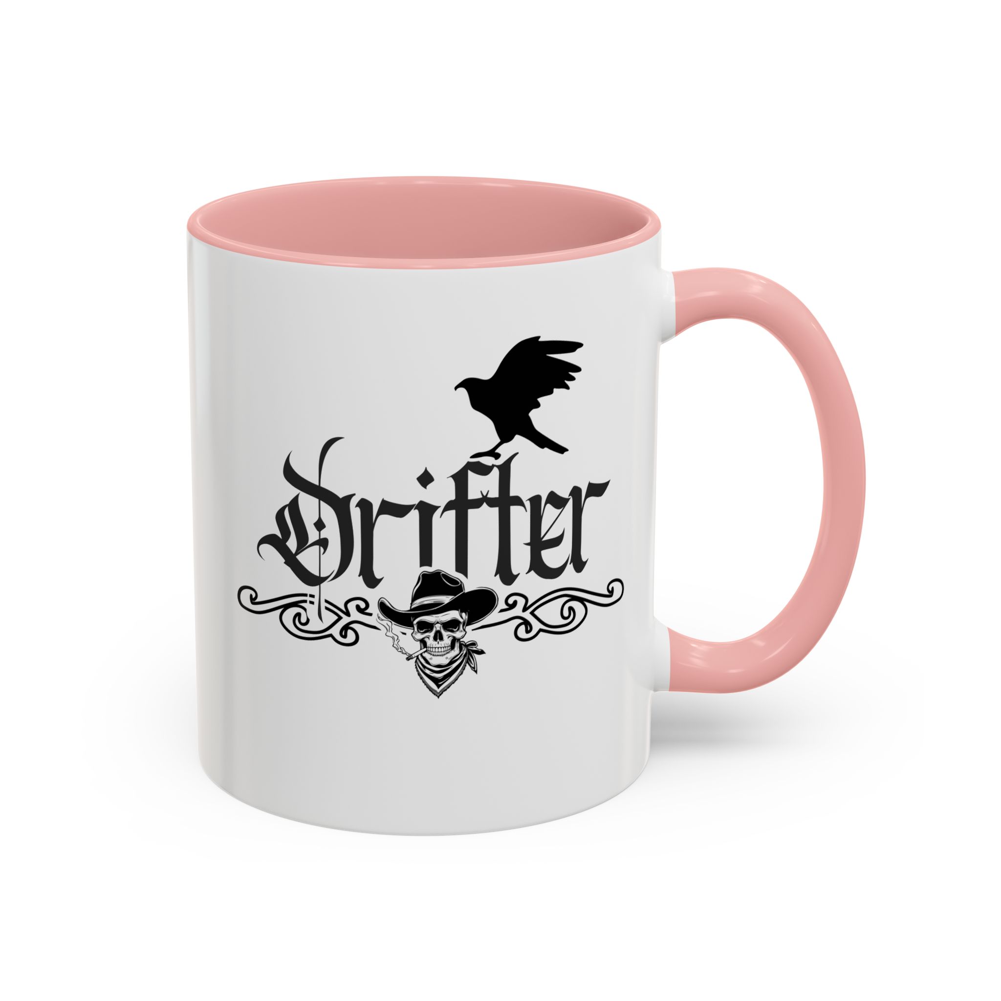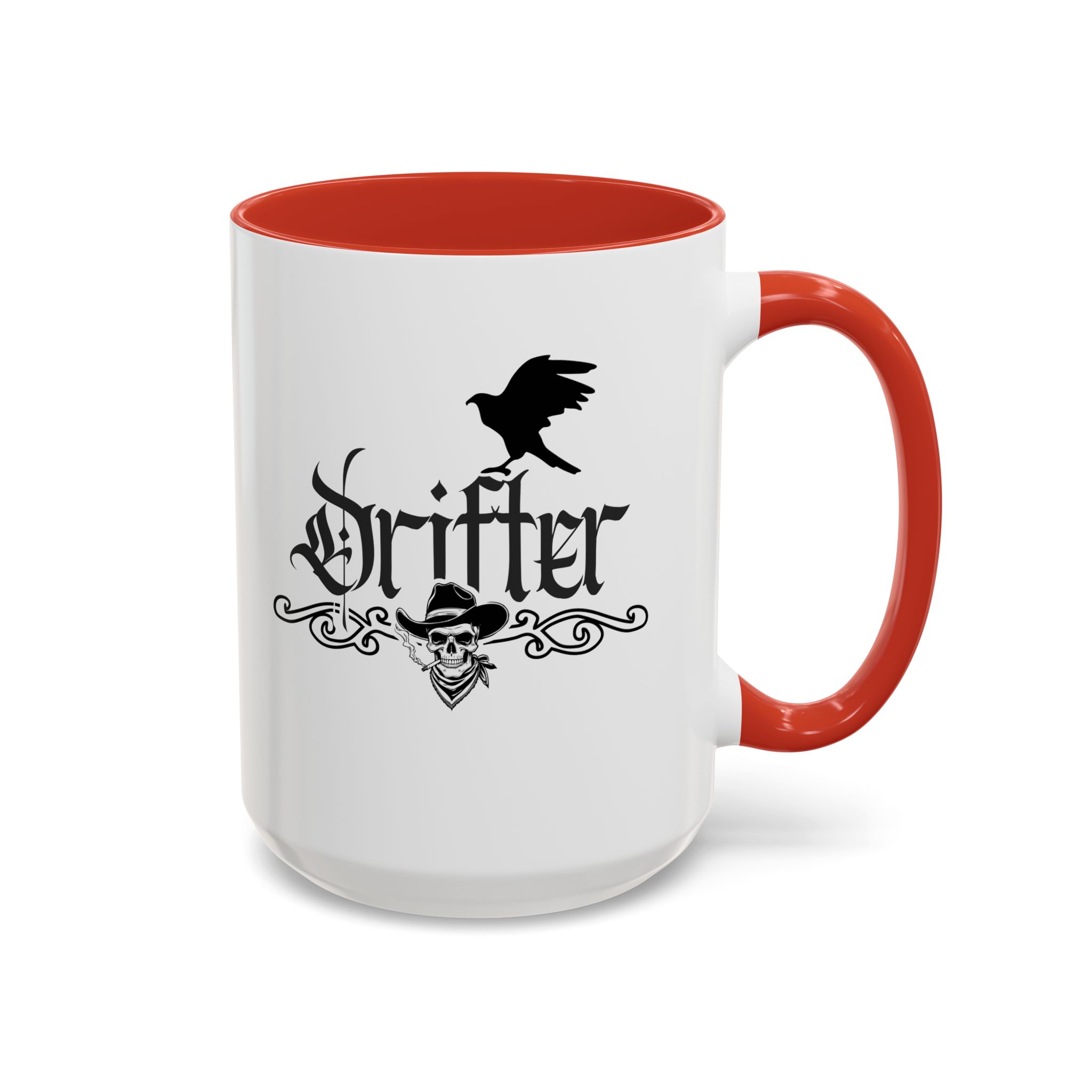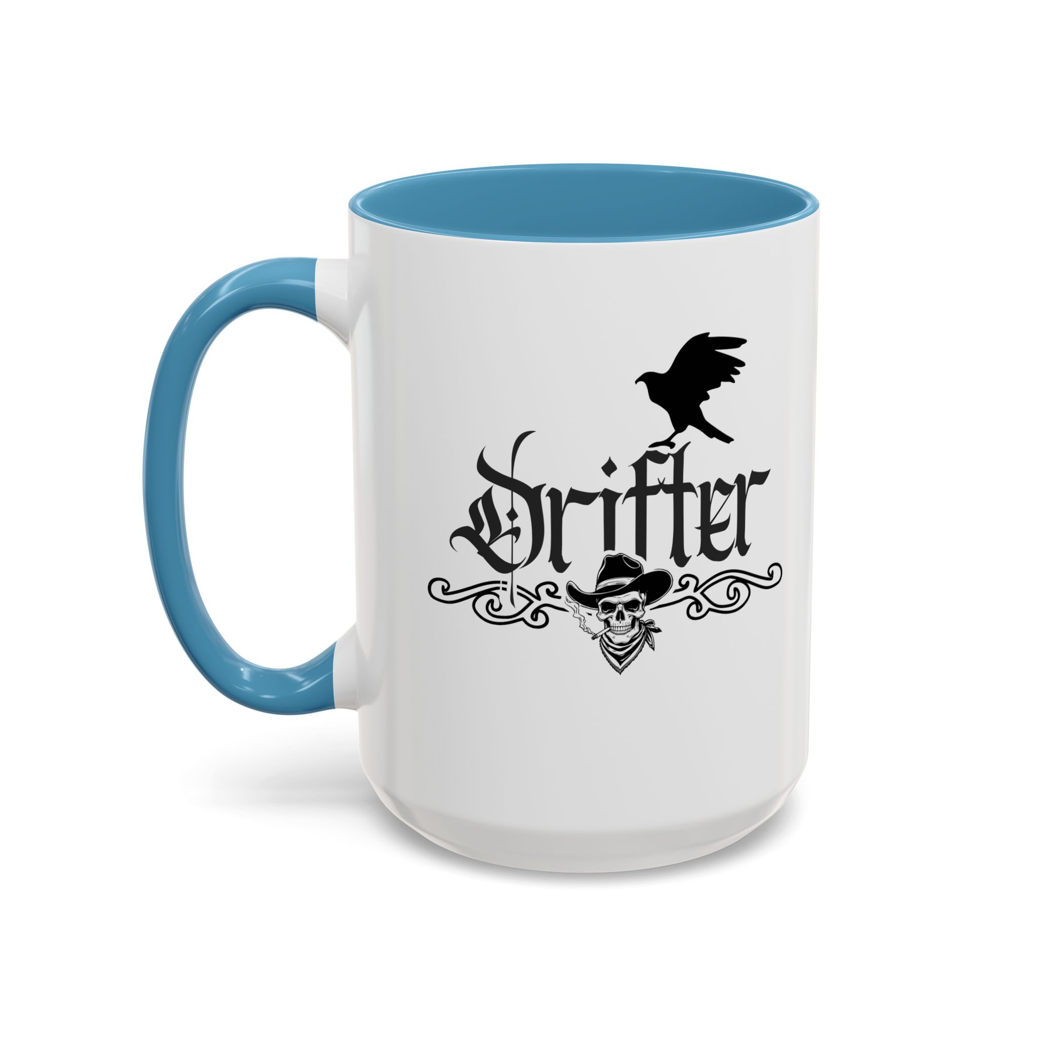 This ceramic accent mug brings a dark, wanderer energy to your morning ritual. A bold black interior and handle frame a stark white exterior, where gothic lettering, a crow in flight, and a skull-in-hat emblem sit like a badge of the road. Sipping from it feels like stepping into a story — smoke-swung diners, empty highways at dawn, and the quiet company of a restless heart. It’s made to be used: glossy finish, dishwasher- and microwave-safe, and available in two sizes so your coffee or tea keeps pace with your day. Choose a contrasting color handle to match the mood you carry.