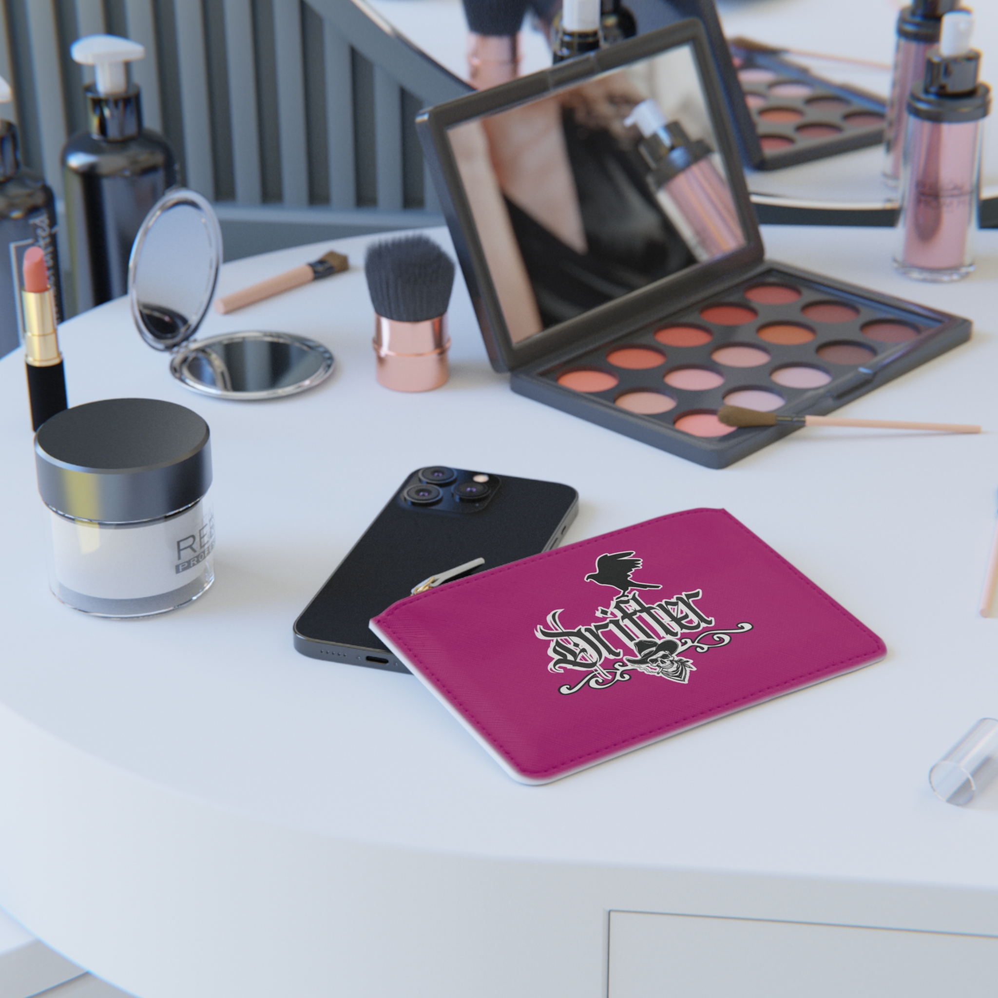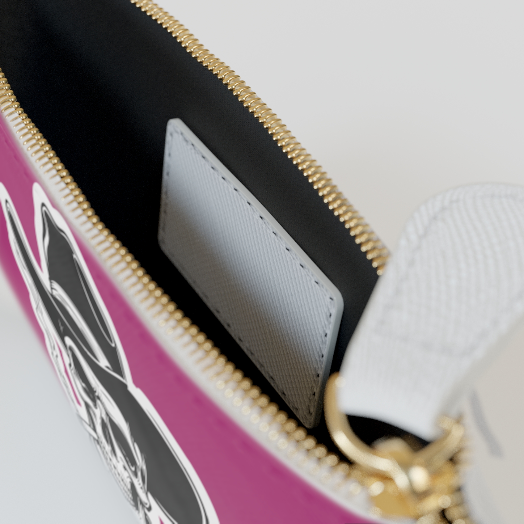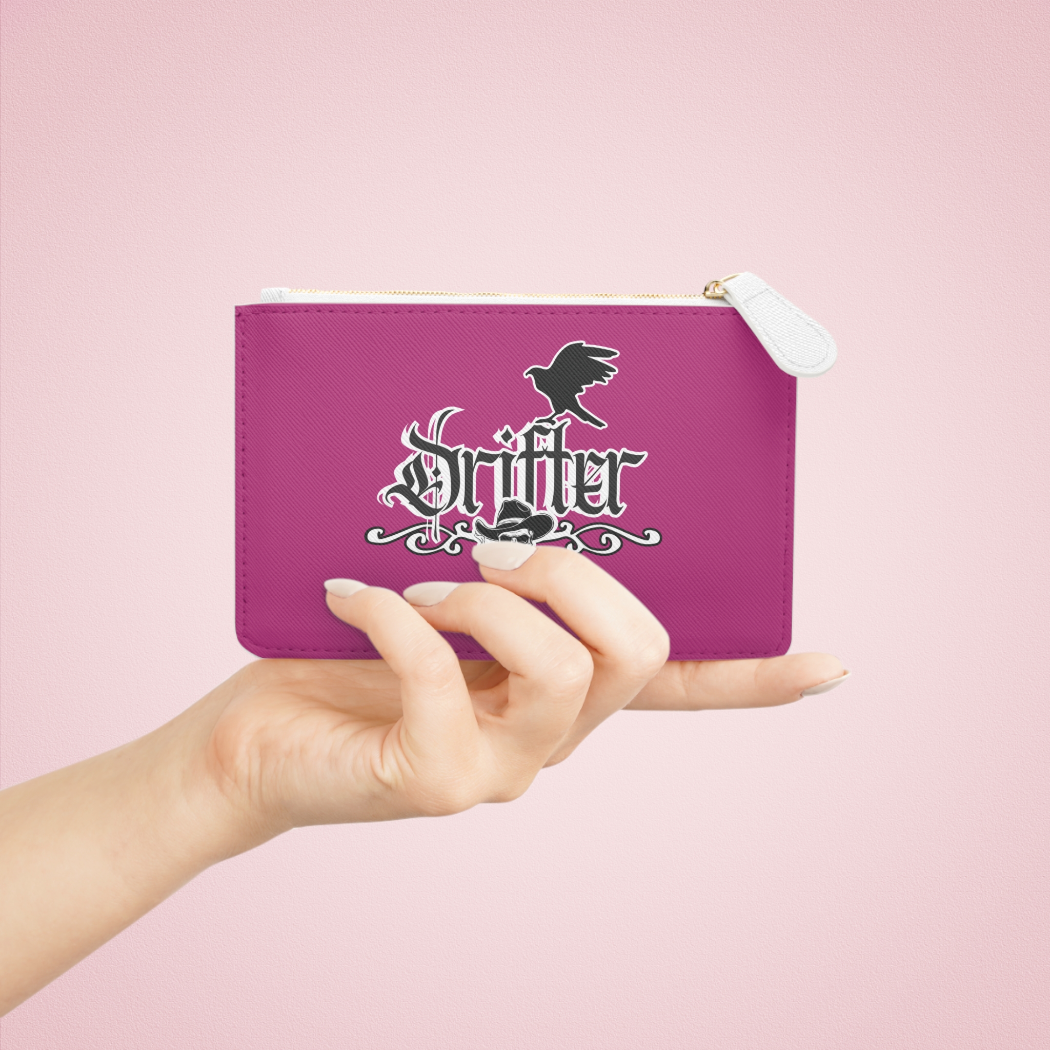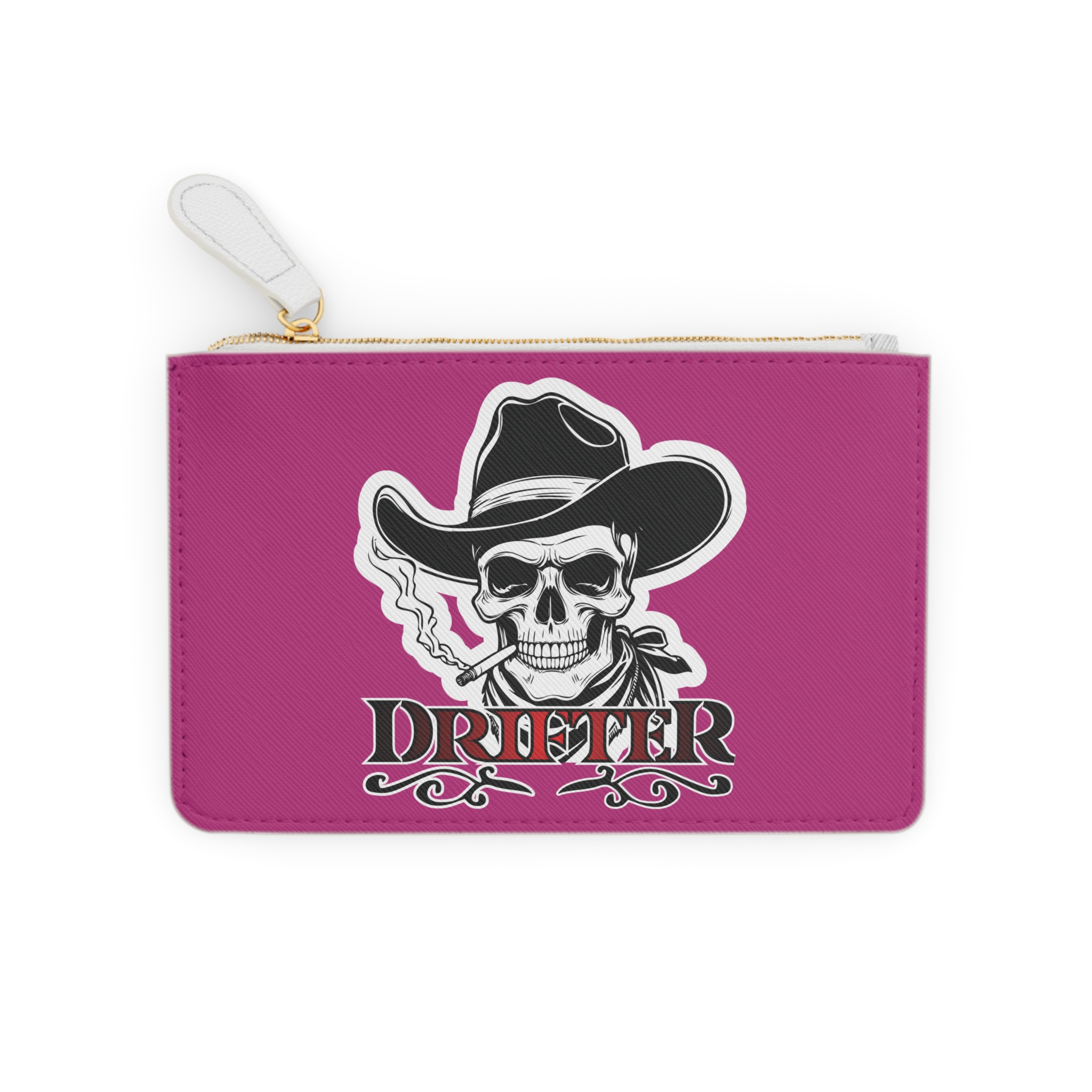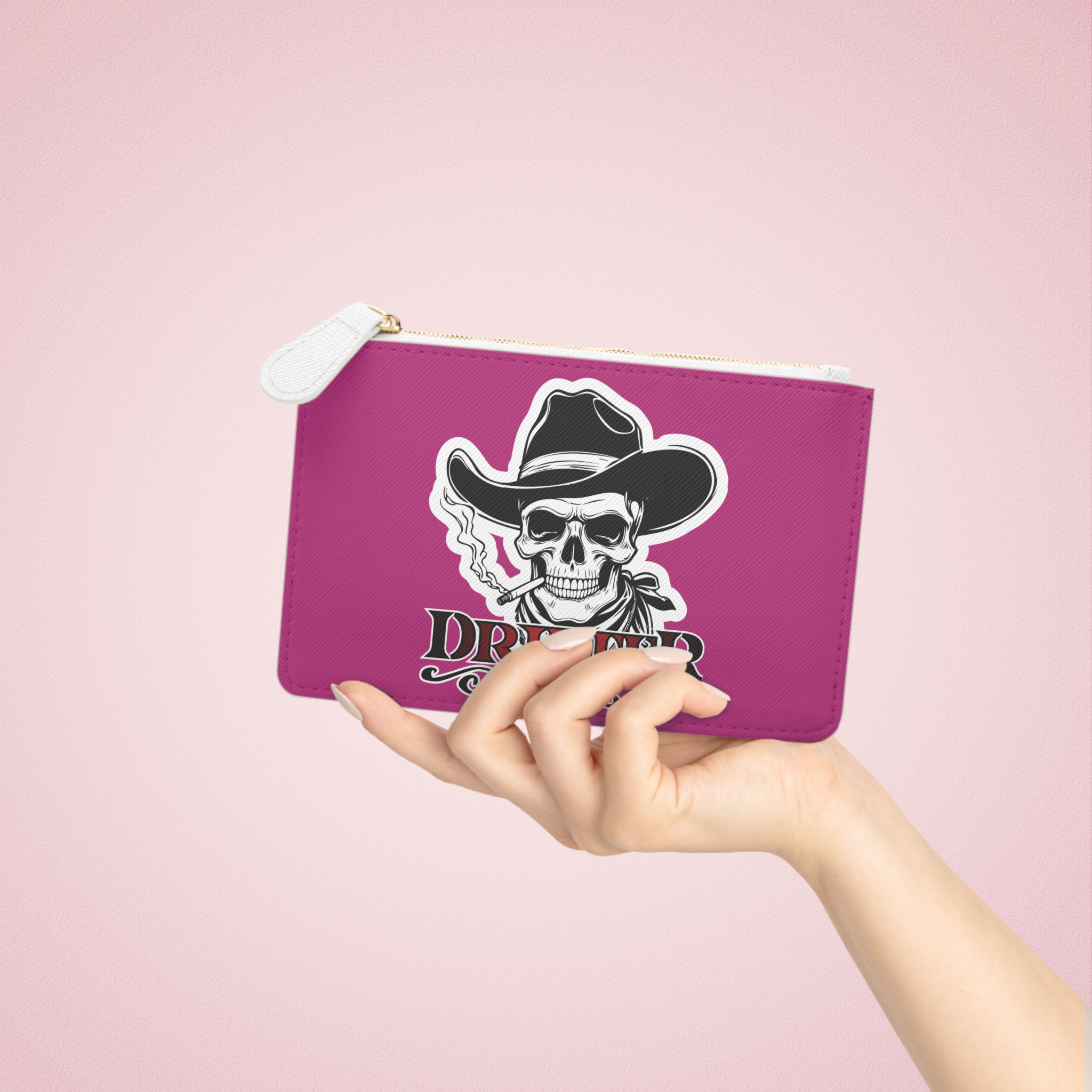 This mini clutch elevates everyday carry with bold attitude and reliable construction. Printed on textured Saffiano faux leather, the double-sided design features striking skull-and-cowboy and raven motifs rendered in crisp, vivid color that won’t fade. A gold-toned metal zipper and pull glide smoothly, keeping cards, cash, and small essentials secure inside one main compartment and a handy internal pocket. The compact silhouette slips into larger bags or works as a standalone pouch for nights out, road trips, or quick errands. Assembled in the USA from globally sourced parts, it combines cruelty-free materials with durable detailing for long-lasting, edgy style.