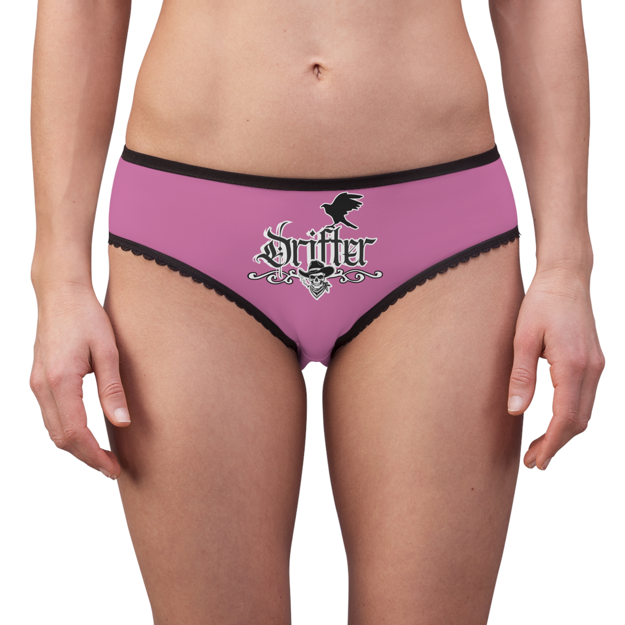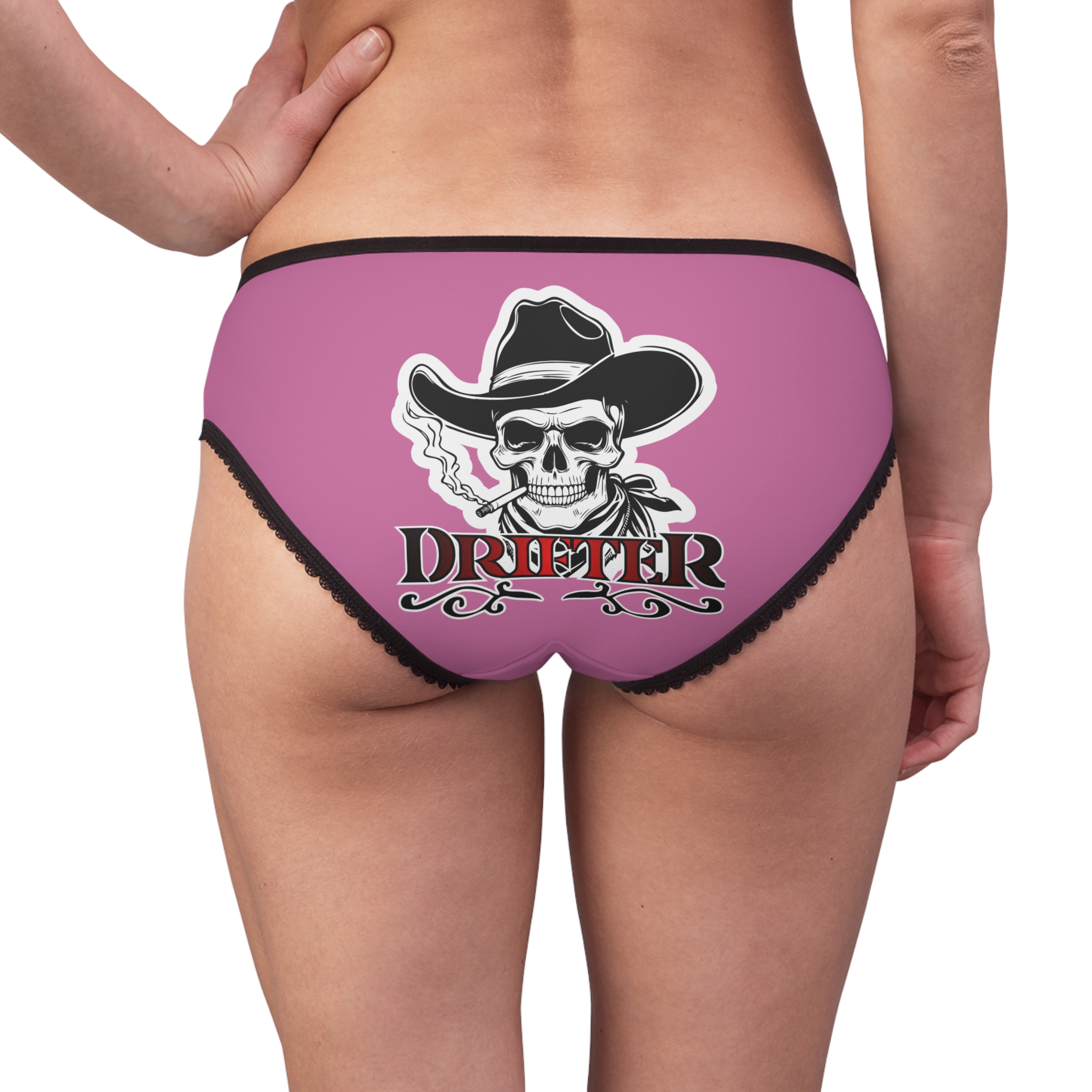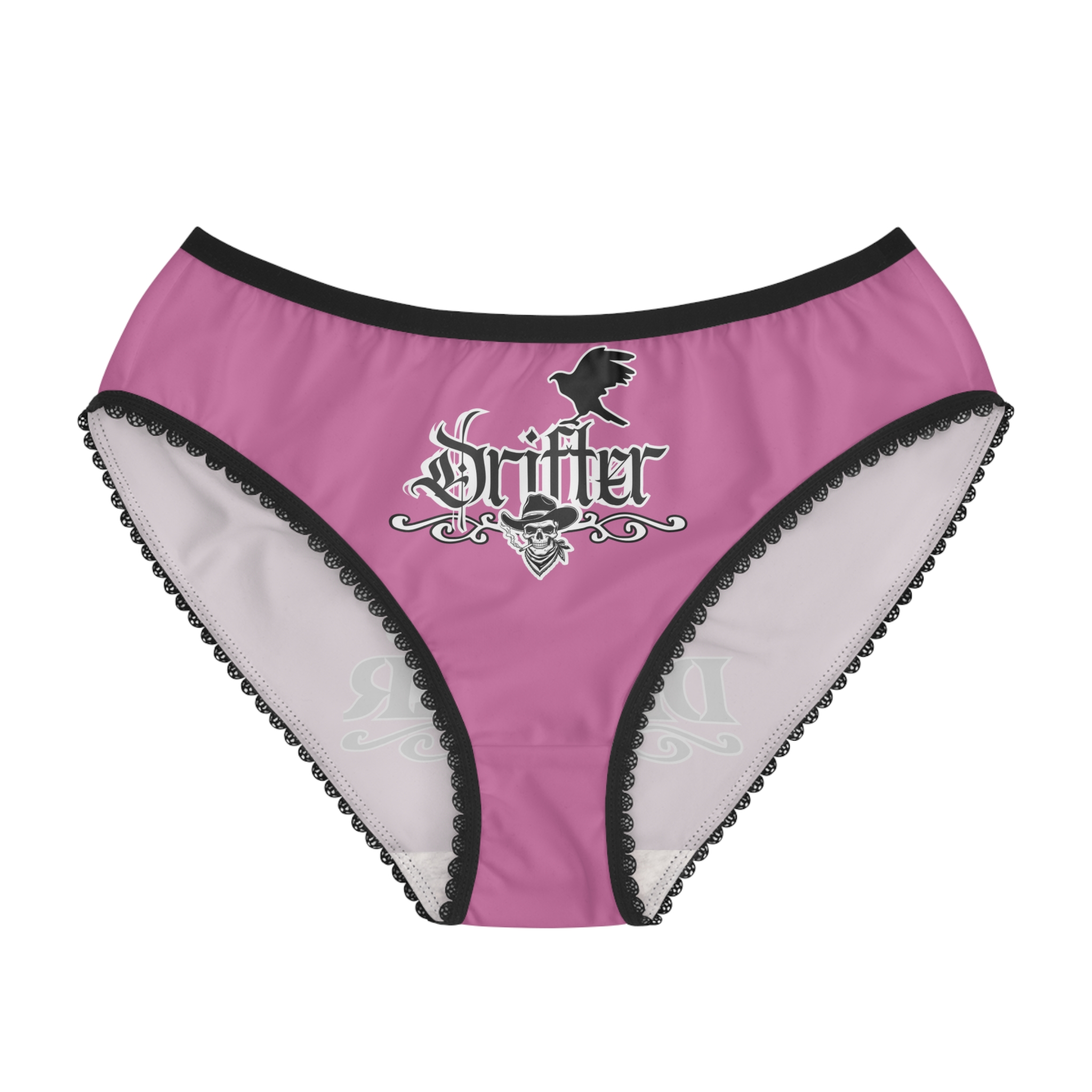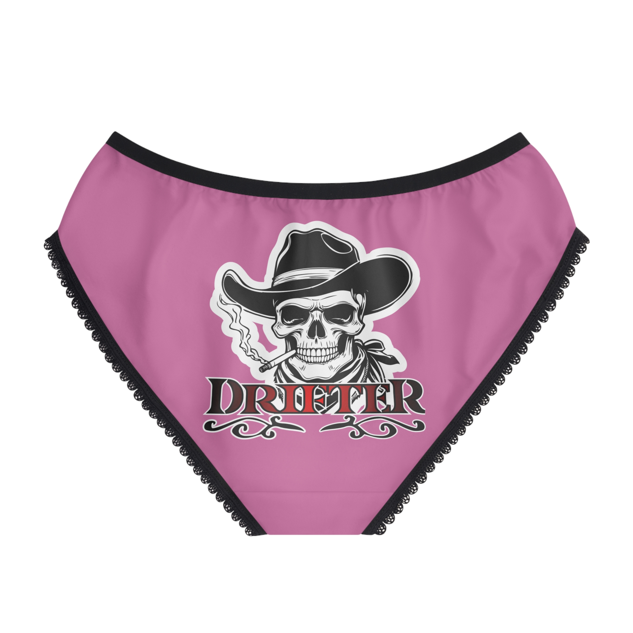 These high-waisted women’s briefs bring bold attitude to everyday wear. The smooth, lightweight polyester feels like a second skin while holding bright, long-lasting prints. Gothic-western artwork — a smoking skull in a cowboy hat and a stylized ‘Drifter’ crest — sits proudly on the front and back, giving these briefs a rebellious, rock-n-roll edge. Scalloped black trim and a soft elastic waistband add a touch of contrast and secure comfort. Wear them under jeans for confidence on the go, pack them for a music weekend, or slip them on when you want a little daring with your daily routine.